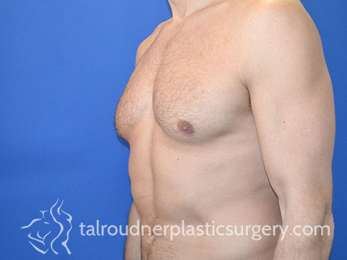 This male patient underwent Suction Assisted Lipectomy as well as partial mastectomy (open removal of breast tissue) by a periareolar approach to treat bilateral breast Gynecomastia (male breast enlargement). 30cc of fat was removed from the right breast and 30cc from the left breast as well as 10 grams of breast tissue from the right breast and 5 grams from the left.